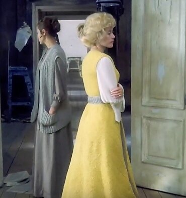 Обратила внимание, что в советских фильмах не мало вязаных вещей. Особенно, если это экранизация классики. Чаще всего это платки и шали, порой просто потрясающие по красоте и работе. Недавно пересмотрела, а скорее всего заново посмотрела «Дядю Ваню» Кончаловского. И поймала себя на мысли, что все женские образы, их четыре, в этом фильме подчёркивают, дополняют и раскрывают вязаные вещи. Судите сами — Елена, жена профессора, её называю русалкой, в неё влюблены, но она холодна. Появляется в вязаном сарафане лимонного цвета. Солнечно-яркая и статная. Редко, когда вязаное изделие так подчёркивает фигуру, а в данном случае ещё и женский образ суть которого — светит, но греет. Мечтательница, и как сейчас бы выразились — трудоголик, Соня, она знает, что делает и знает зачем. Бесформенный жилет не для красоты — в нём тепло и удобно. В оттопыренных карманах можно согреть озябшие руки и положить связку ключей от кладовых и кладовок. Эмансипе маман, в галстуке и лампасах, как только впервые появи