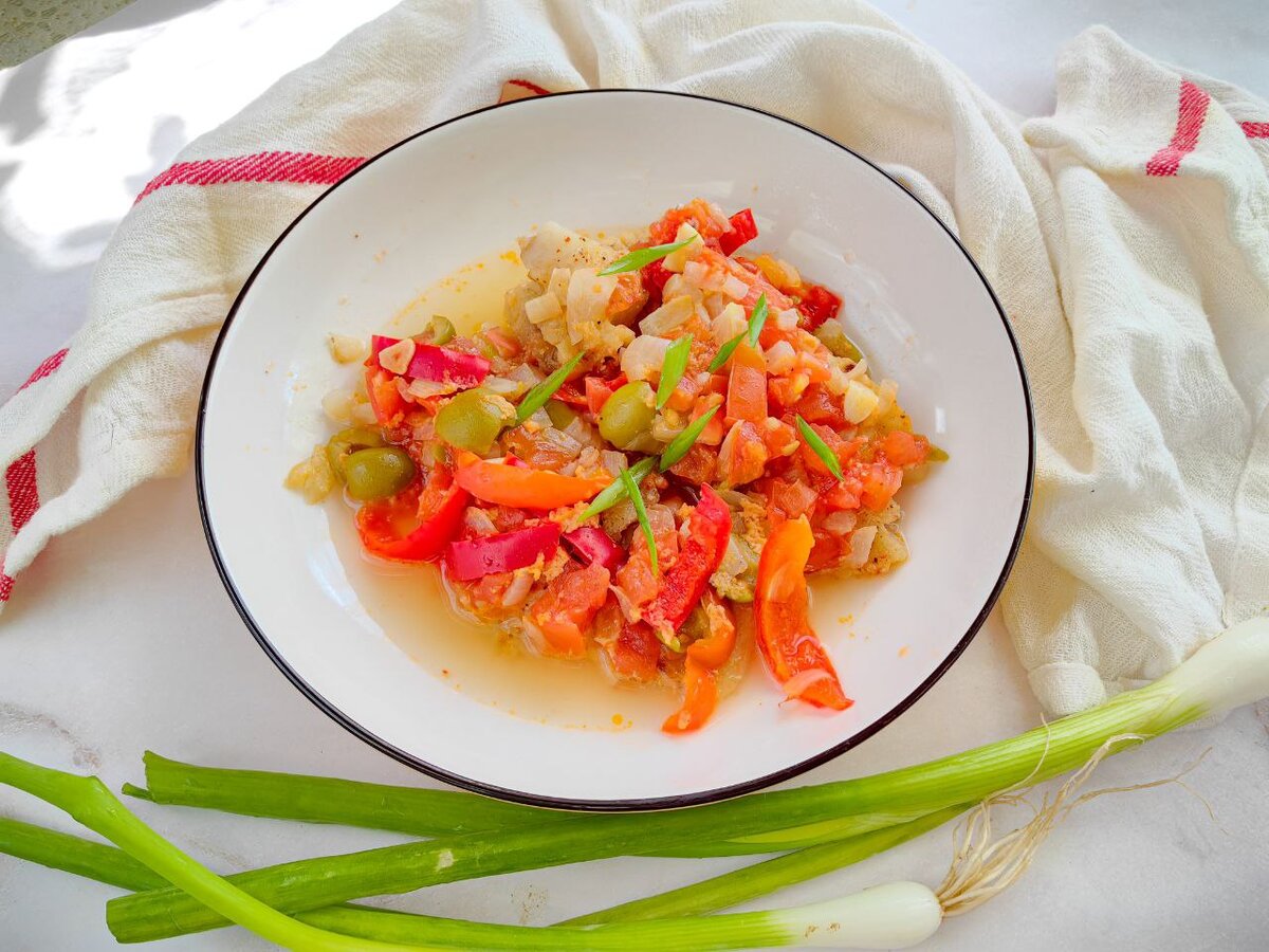 На приготовление этого блюда меня вдохновил рецепт саламис (это рецепт греческой кухни). Я немного изменила состав ингредиентов, а также способ приготовления и сервировки. Думаю, что рыба только выиграла от этого. Съели с огромным удовольствием. Полный список ингредиентов в конце статьи Лук и чеснок мелко порубить. В сковороду влить масло, нагреть его. Выложить лук с чесноком и слегка обжарить, постоянно помешивая пару минут. Остальные овощи нарезать произвольно. Нет какого-то правила на сколько мелко их нужно резать, следует руководствоваться своим предпочтениям. Мне нравится, когда сладкий перец чуть крупнее, поэтому остальное нарезала мельче. Добавить овощи к луку с чесноком, накрыть крышкой и тушить на не очень сильном огне минут 15. Тем временем рыбу посолить и поперчить и обжарить на другой сковороде с двух сторон. В зависимости от типа и вида рыбы, можно обжаривать ее сразу большими кусочками, а можно нарезать на порционные, поменьше. Как овощи будут готовы, выложить их сверху