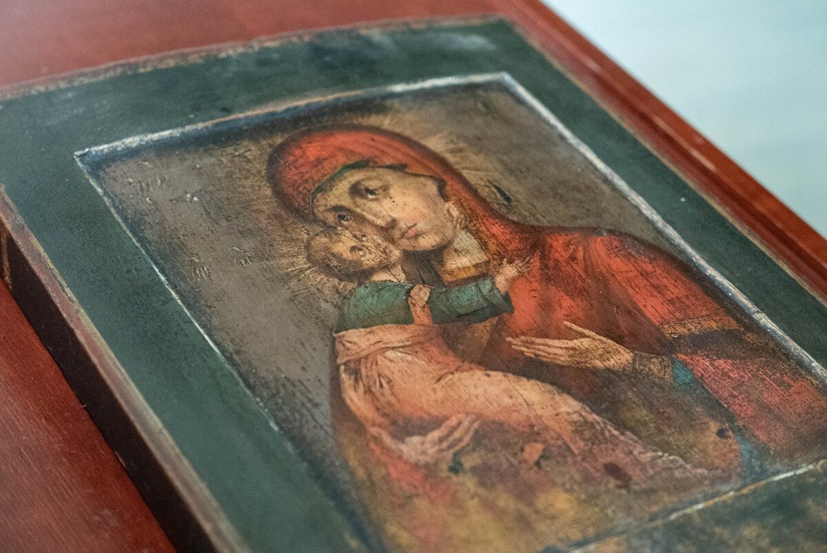 Звонок. Одноклассник, который появляется раз в 10 лет. "Ты в храме?"Да. Приезжает и приносит черную доску, которая валялась где-то в которой с трудом угадывается икона и с очень большим трудом икона Богородицы. Видно, что кто-то выжигал глаза Матери Божией и чем-то острым перечеркнул крест накрест весь образ. Куда девать? Положил в храме на аналой, пусть лежит. И образ начал оживать. Фотографии актуальные на сегодняшний день. Многие удивляются, хотя чему? Если мы будем валяться в кустах - нас будет плохо. Если нас вернуть домой, то мы расцветем. Вот и образ оживает, оттаивает потому что вернулся домой в дом Предвечного Сына.