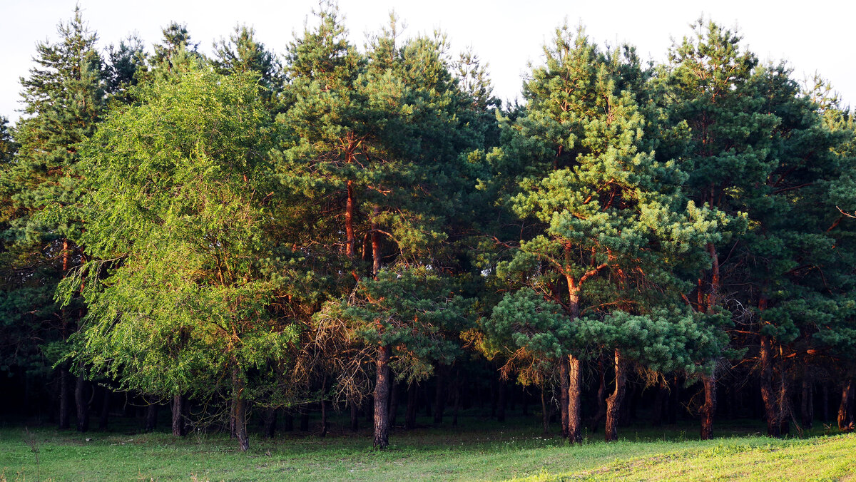 Приближающаяся осень для стоящих на желтеющей траве вечнозеленых сосен будто даже и вовсе не заметна.