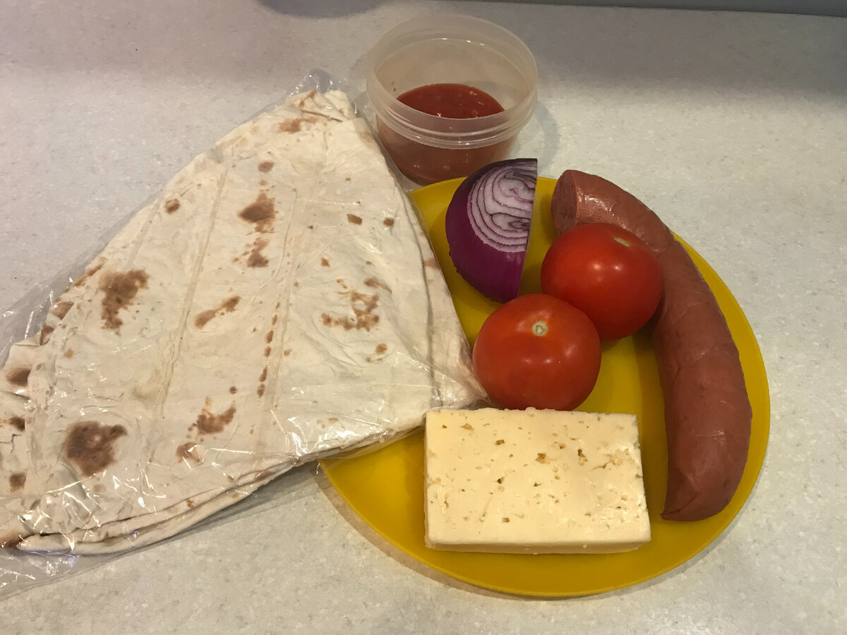 Основа у такой пиццы получается тонкая, как любят многие. Края у такой пиццы получаются хрустящими, а середина мягкая и сочная. Побежали на кухню. Для пиццы я подготовила: 1. Если у вас круглая форма, то нужно вырезать два круга из лаваша по ее размеру. Я взяла большой противень и оба круга туда идеально поместились. 2. Чтобы пицца не пригорела можно постелить пергаментную бумагу или смазать форму растительным маслом. Выложила первый круг на противень. ⅓ часть сыра натерла на терке и распределила по лавашу. Если у вас остались обрезки выложите их на сыр. 3. Выложила второй круг из лаваша и смазала его томатным соусом. На соус положила колбасу, нарезанную тонкими кружками. 4. Лук почистила, помыла, нарезала тонкими полукольцами. Помидоры помыла и нарезала тонкими дольками. Разложила овощи на пицце. 5. Остальной сыр натерла на терке и посыпала им всю поверхность пиццы. 6. Духовку разогрела до 180 градусов и выпекала пиццу 7 минут. Дольше выпекать не стоит, так как лаваш может высох