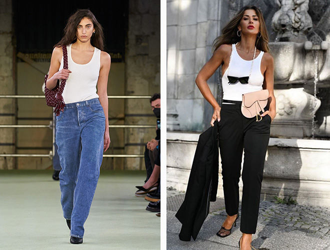 В модном мире 2023 года абсолютной иконой стала обычная белая майка "алкоголичка". Мы можем носить её как топ, сочетая с юбкой по аналогии с дизайнами Prada, со светлыми брюками, или просто и эффектно объединить с незамысловатыми, но всегда удачными джинсами.