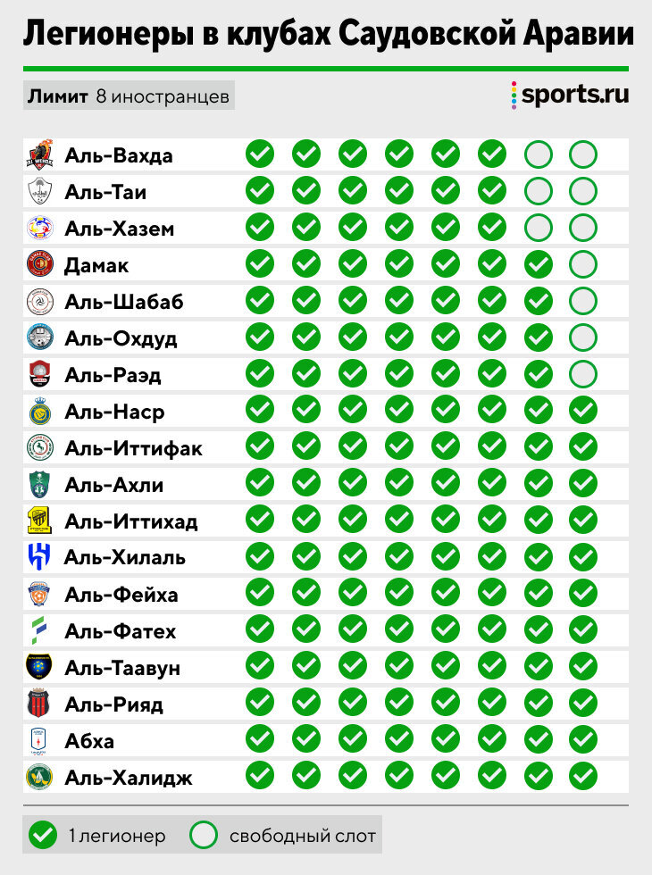 «Аль-Насру» уже нужно кого-то отзаявить. Кажется, в Саудовскую Аравию звезды приезжают каждый день: Отавио перешел из «Порту» в «Аль-Наср» за 60 млн евро, теперь приземлился и Эмерик Лапорт из «Сити». После бесконечных трансферов в местную лигу можно было предположить, что в Саудовской Аравии вообще нет никаких ограничений. Неожиданно, но там есть лимит на легионеров! Раньше он был достаточно жестким: до сезона-2016/17 местные клубы могли заявить до четырех иностранцев, а вратарь должен был быть исключительно из Саудовской Аравии. Позже количество слотов увеличили до восьми, а правило с вратарями отменили. Именно поэтому в воротах «Аль-Фейхи» играет серб Владимир Стойкович, а «Аль-Иттихад» Карима Бензема спасает бразилец Марсело Гроэ. А как дело обстоит с легионерами в заявках? Изучаем! • Все топ-клубы уже укомплектовали ростер легионеров, если только продавать действующих ради покупки новых. И это не просто слова: так, «Аль-Иттихад» уже хочет избавиться от нападающего Жоты, приобретен