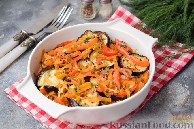 Закуска из запечённых баклажанов со сладким перцем и морковью готовится очень просто. Кружочки баклажанов запекаются в духовке, остальные овощи обжариваются на сковороде, сдабриваются чесноком и пряными травами. Овощи заливаются маринадом и настаиваются в холодильнике. В результате получается островато-пряная закуска с кисло-сладким вкусом – идеально!