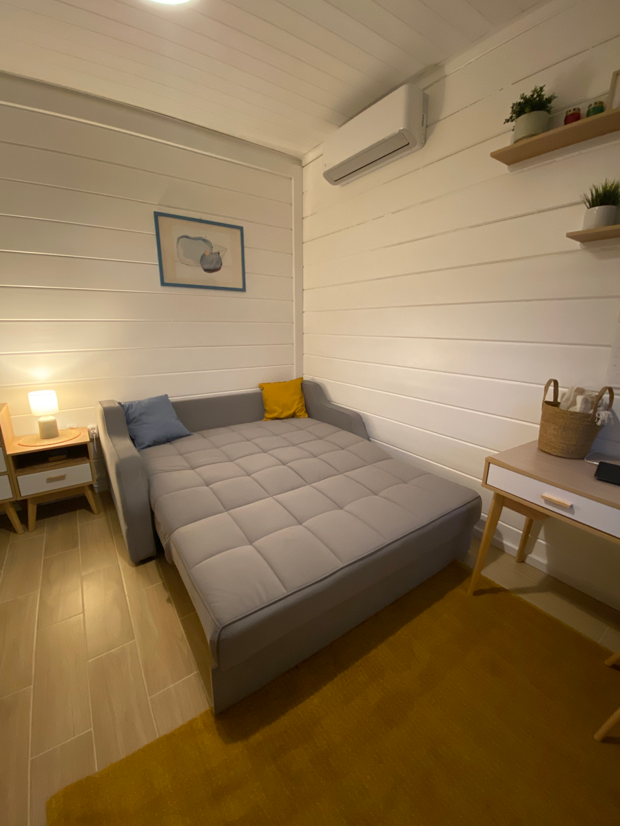 Когда в небольшой спальне стоит большая кровать, помещение всегда выглядит загромождённым. И вот тут всегда дилемма: то ли красоту создавать, то ли удобство. Продолжая рассказывать о том, как мы обустраивали нашу спальню/кабинет, остановлюсь на этом важном моменте, так как у нас был риск "убить" не только интерьер этой комнаты, но и мечту о свежести и комфорте. Мало того, что мы купили серый диван под предполагаемую бело-серо-жемчужную палитру (которая нам категорически не подошла), так ещё и встал вопрос, чем это серое (но, увы, очень удобное) изделие закрыть? А то, что надо закрывать, по сути, большую широкую кровать, сомнений не было. Вот так выглядел наш диван в разложенном виде: А это вид сбоку (в период, когда спальню ещё только начинали обустраивать). Согласитесь, это серое пятно в центре комнаты выглядит ужасно? (В жизни было ещё хуже, чем на фото). Я немного расстроилась, потому что не представляла, ЧЕМ это всё можно застелить так, чтобы как-то "рассредоточить" плоскость разло