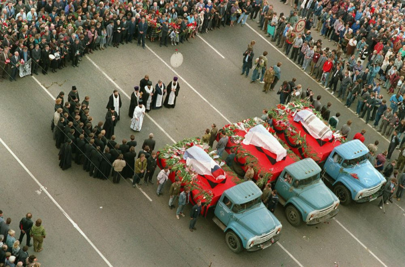 24 августа 1991 года происходили похороны трёх погибших в ходе Августовских событий защитников Белого дома — Комаря, Кричевского и Усова. Много лет спустя появилось выражение «небесная сотня» Евромайдана, по аналогии, этих троих можно было бы назвать «небесной тройкой» Августа-1991. Обратите внимание, какая толпа духовенства тянется за гробами. Отпевали их и православные священники, и раввин (Илью Кричевского хоронили по иудейскому обряду). Что было логично, ведь служители и князья церкви стали важными выгодоприобретателями от переворота 1991 года. Разумеется, если не считать главных бенефициаров — буржуев и бандитов (или я повторяюсь?).