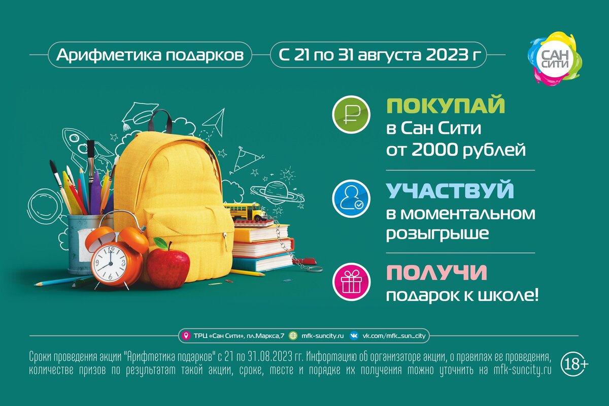 Получить подарок просто как раз, два, три! В ТРЦ «Сан Сити» проходит акция «Арифметика подарков». Совершите покупки на сумму от 2 000 рублей в ТРЦ «Сан Сити» с 21 по 31 августа 2023 года и получите гарантированный подарок к школе. Приближается новый учебный год, а с ним и большие траты. Новая школьная форма, рюкзак и канцелярские принадлежности – всё это далеко не полный список покупок к 1 сентября. Мы подскажем, как решить эту непростую задачу – успешно подготовиться к новому сезону и сэкономить семейный бюджет. Приезжайте в ТРЦ «Сан Сити, здесь вы найдёте всё необходимое к школе в одном месте и сможете получить за это полезные подарки. Заманчиво, не правда ли? Просто совершайте покупки в магазинах комплекса на сумму от 2000 рублей (одним чеком), подходите с чеком на стойку информации на 1-м этаже комплекса, стирайте защитный слой на скретч-карте и узнавайте, какой подарок достался именно вам! И помните, что чем больше покупок вы совершите, тем больше подарков сможете получить! Шопинг
