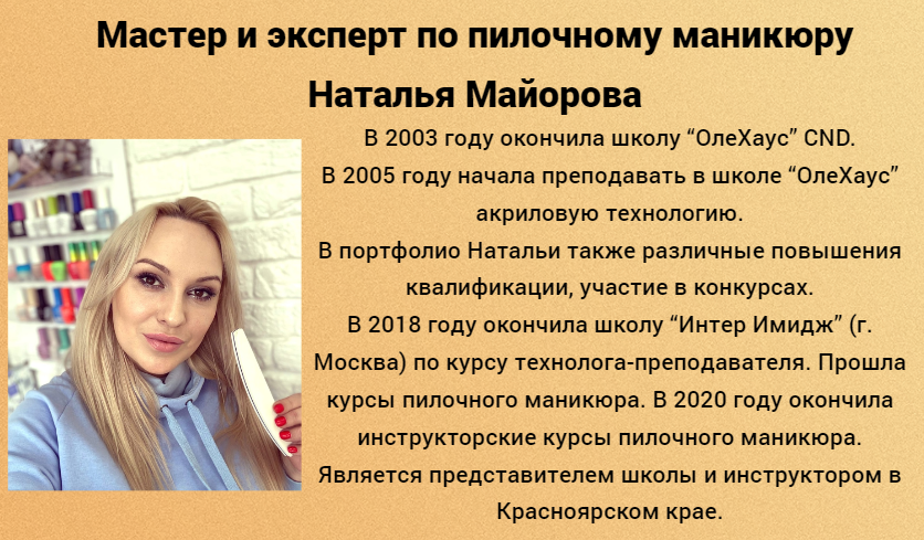 О пилочном маникюре нам рассказала Наталья Майорова — практикующий мастер маникюра с 20-летним стажем и преподаватель курсов с тремя дипломами инструктора.