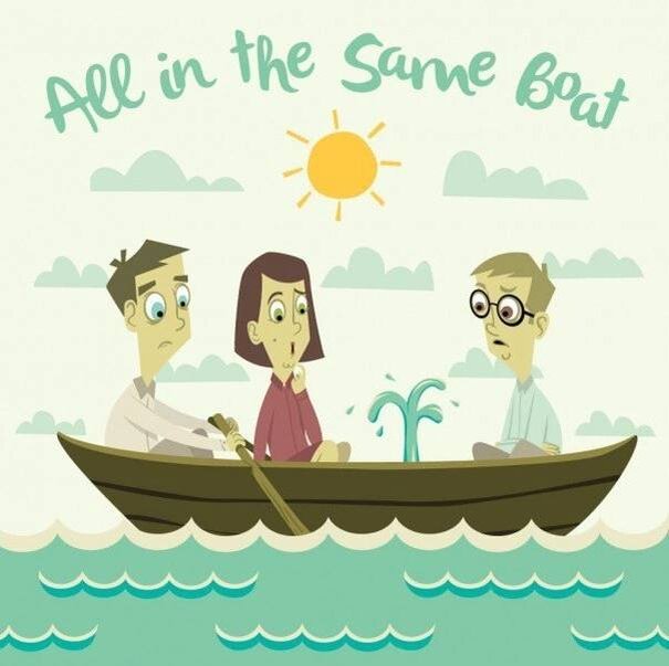 to be in the same boat (дословно - быть в одной лодке) - находиться в такой же сложной или неприятной ситуации, как и другие. Don’t complain! We’re all in the same boat. complain - жаловаться