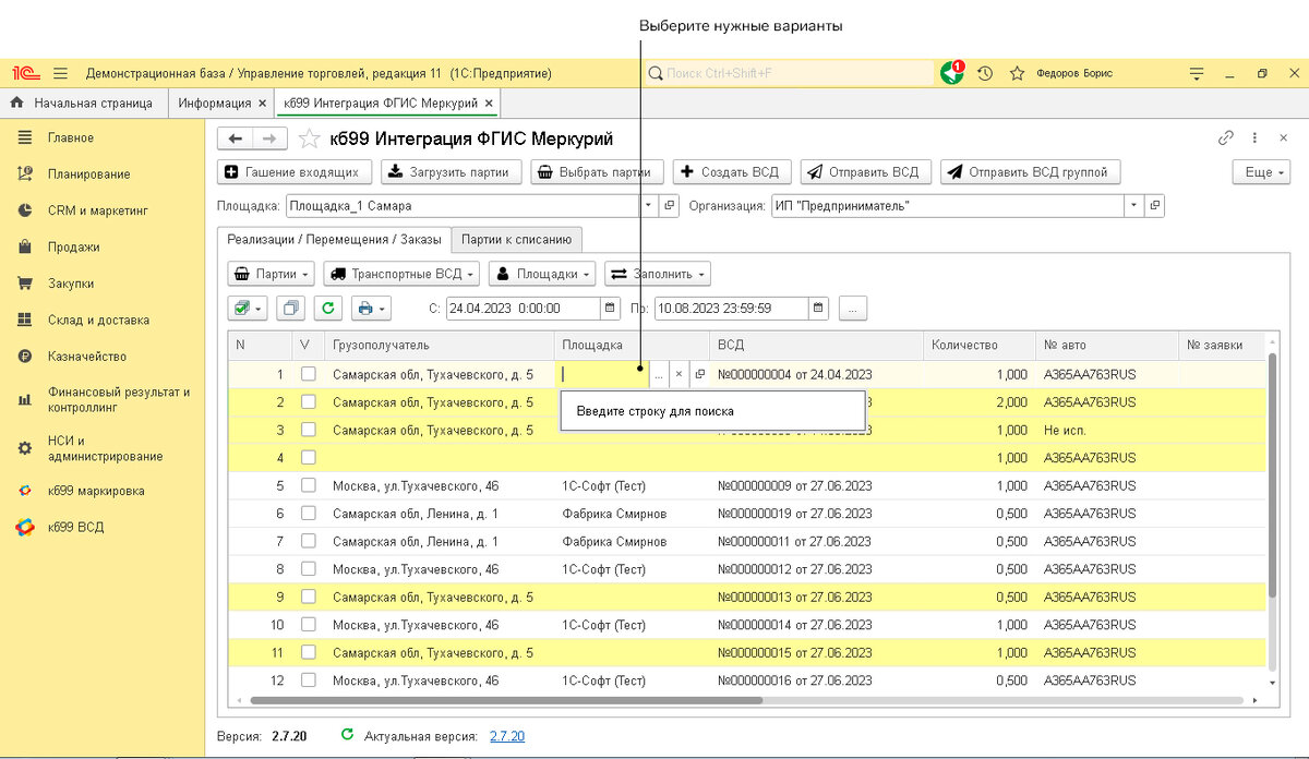Для установки соответствия площадок необходимо перейти в раздел "Интеграция ФГИС Меркурий" на вкладке КБ99. В поле "Площадка" нужно выбрать нужные варианты. После этого, можно переходить к следующему шагу - установке соответствий номенклатуры.
