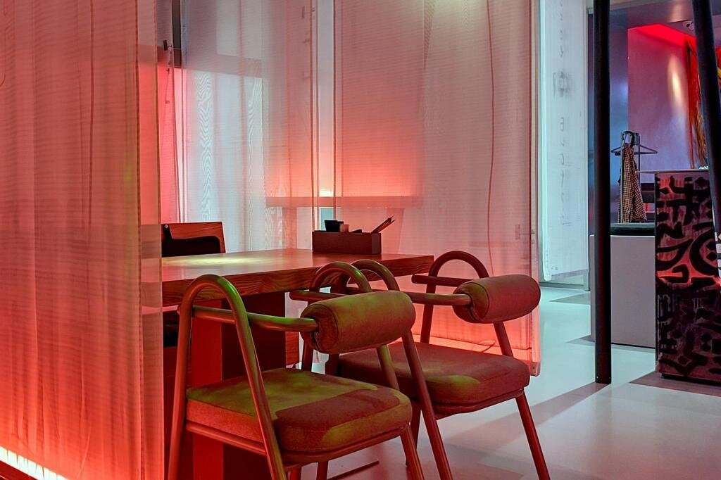 Это мой первый визит в основной зал — он занимает часть холла «Миража». Ранее пользовался лишь барной зоной, со столами-магазинными тележками и высокой посадкой под пластиком искусственных лиан. И представьте себе — мне в большом зале понравилось! Темновато, но я знал, куда иду. Тканевые полосы мягко разделяют зал, но не режут его на клетушки, есть ощущение общности, но соседи не мешают — о них лишь догадываешься по негромким разговорам о здоровье и юане. Одна претензия на сегодня: стул неустойчив. В самом прямом значении стул. Мебель удобная и вполне соответствует вывеске — но именно мое мини-кресло все время шаталось. Однако перейти куда-то еще не хотелось. Причуды зоны комфорта!