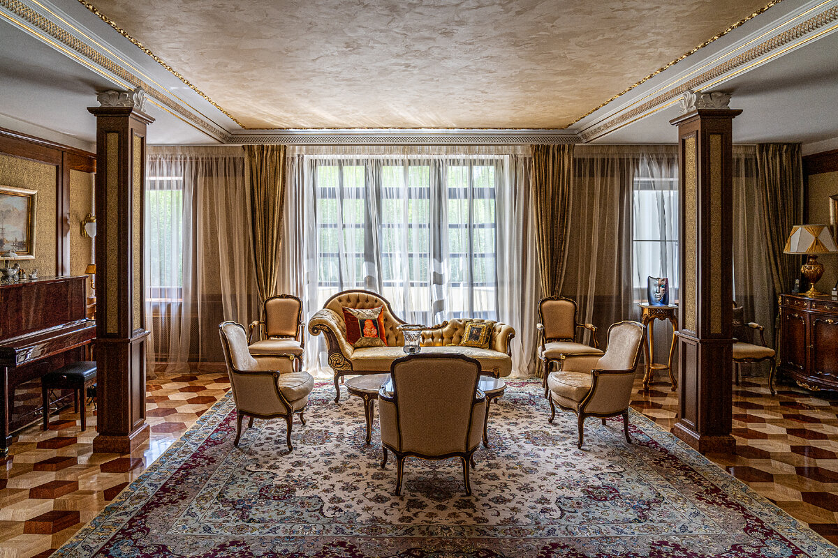 В ателье Togas Couture обратилась хозяйка большого загородного особняка, которая хотела полностью обновить все шторы за короткий срок, чтобы успеть к особенному семейному событию. В классическом интерьере этого дома ранее были характерные для него портьеры из тяжелого бархата с большими ламбрекенами, золотой бахромой.