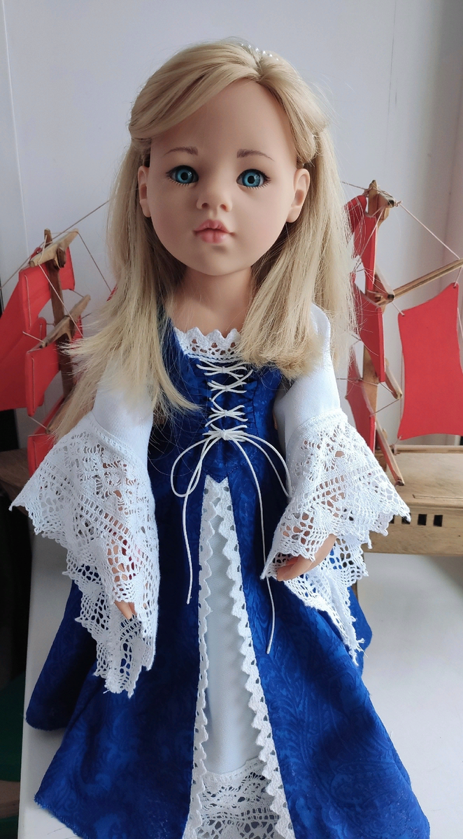 Теперь пока не надоест, буду шить наряды куклам. А еще школьная форма в планах, ведь скоро в школу и надо успеть хоть одну куколку отправить вместе с внуком в первый класс. Весь интернет прошерстила, ну нигде нет готовой выкройки или бесплатного МК на школьную форму. Придется свою головушку поднапрячь, Когда-то она не плохо с этим справлялась, когда девчонки были школьниками, а в магазинах был только ширпотреб, гнали все одинаковое, сейчас думаю может потому, что надо было много школьных платьев. А сейчас покажу наряд "Василиса" по мк Натальи Костяковой. Моделькой выступает София Готц, наверное из-за ее голубых глаз. Хотели подкрутить волосы, но не знаем как, на плойку не держатся. А потом подумали с ней , да и пусть будут прямые, вон внучка у меня кучерявая, так все время старается выпрямить их утюжком. Я конечно ругаюсь, ей так хорошо с кудрями, да и не у всех они есть, радовалась бы, а не избавлялась. Говорю, вот обидятся кучери и покинут твою голову. Подружка в школе была, так у не