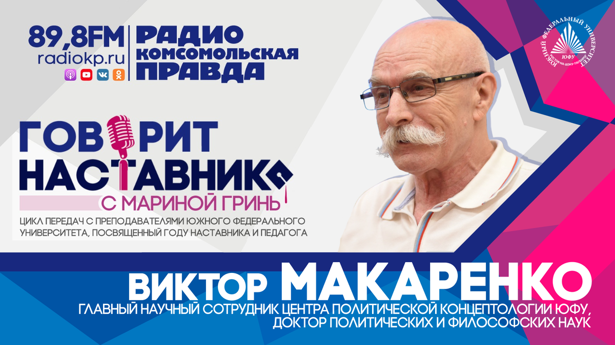 В эфире радио КП-Ростов прозвучала новая программа из совместного цикла КП и Южного Федерального Университета «Говорит наставник», приуроченная к Году наставника и педагога в России. На этот раз гостем радиостанции стал профессор, доктор политических и философских наук, главный научный сотрудник Центра политической концептологии Института философии и социально-политических наук ЮФУ Виктор Павлович Макаренко.