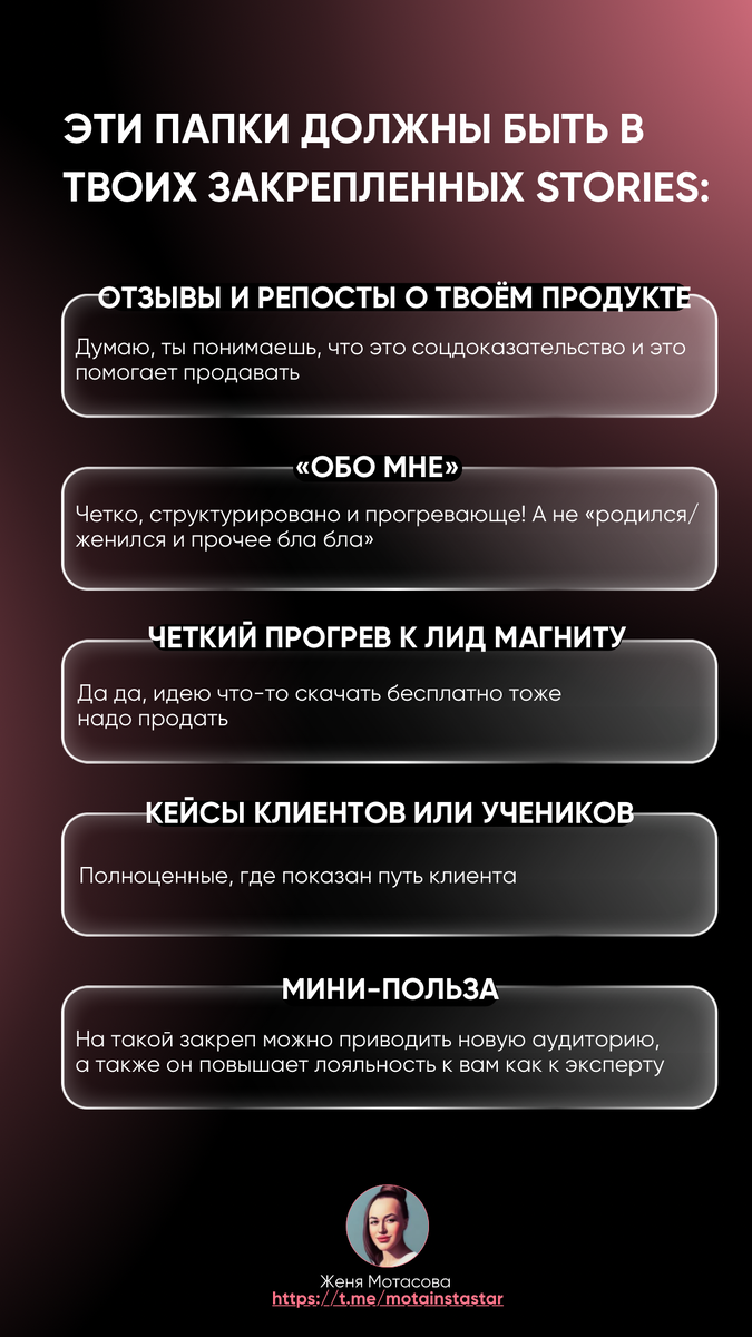 Эти папки должны быть в закрепленных сторис: 1.ОТЗЫВЫ И РЕПОСТЫ О ТВОЁМ ПРОДУКТЕ думаю, ты понимаешь, что это соцдоказательство и это помогает продавать 2.«ОБО МНЕ» Четко, структурировано и прогревающе! А не «родился/женился и прочее бла бла» 3.ЧЕТКИЙ ПРОГРЕВ К ЛИД МАГНИТУ Да да, идею что-то скачать бесплатно тоже надо продать 4.КЕЙСЫ КЛИЕНТОВ ИЛИ УЧЕНИКОВ Полноценные, где показан путь клиента 5.МИНИ-ПОЛЬЗА На такой закреп можно приводить новую аудиторию, а также он повышает лояльность к вам как к эксперту Больше советов, практик и рабочих схем по продажам в моем тг-канале, переходи по ссылке и подписывайся https://t.me/motainstastar