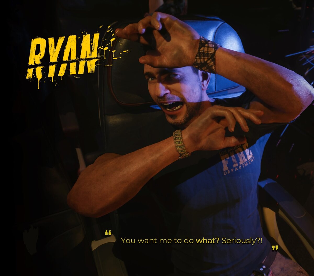 Из шести протагонистов на выбор, я выбрала самого обычного на внешний вид героя, но самого необычного по сложившийся ситуации - это стриптизер, которому пришлось притвориться пожарником, чтобы получить шанс выжить в зомби апокалипсисе. И Господи, я ни разу не пожалела о своем выборе - Райан дико забавный, поначалу ему приходится играть роль бесстрашного пожарника, хотя когда он один, он дико стрессует по поводу всего, что происходит вокруг. В середине игры он уже смиряется с ролью героя и действительно становится храбрым выживальщиком, способным решать и свои, и чужие проблемы. А к концу - он уже готов надирать зад любому, кто встанет на его пути.