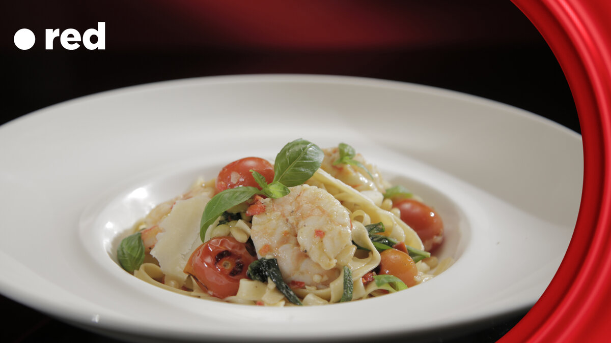 Смотрите любимое телешоу и слюнки текут от вкусной еды? Готовьте вместе с героям каждый день, а мы поможем вам с рецептами! ИНГРЕДИЕНТЫ сок 1 лимона 50 г пармезана, натертого ПАСТА 400 г пшеничной муки 4 яйца СОУС 60 мл оливкового масла 250 помидоров черри соль и перец по вкусу 25 г сливочного масла, нарезанного кусочками 2 зубчика чеснока, измельченных 1 длинный красный перец чили, нарезанный тонкими ломтиками мелко натертая цедра 1 лимона 5 листочков шалфея, нарезанных 80 мл сухого белого вина 20 средних сырых (серых) креветок, очищенных 50 г кедровых орешков, обжаренных 1 стакан листьев базилика ПРИГОТОВЛЕНИЕ 1. Сделайте пасту. Высыпьте муку на рабочую поверхность и сделайте углубление в центре. Влейте яйцо. С помощью вилки постепенно замешивайте муку к центру, добавляя немного воды, если потребуется, чтобы получилось мягкое, пластичное тесто. Его консистенция правильная, если при нажатии большим пальцем он выходит из теста сухим. 2. Вымесите тесто на слегка подпыленной мукой рабоч