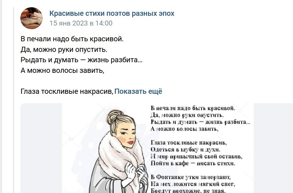 Мне тут сейчас прислали ссылку на одну группу, где мое старое стихотворение как-то выложили. И еще рисунок на него нарисовали. Удивительно, но так оно все и было. Так я тогда и выглядела (только толще в два раза. :)). А вот шуба была почти такая же. И даже жест такой же. (Это фото автор рисунка точно не видел). Текст все же продублирую, на рисунке такой шрифт, что глаза сломаешь. Катькин сад В печали надо быть красивой.