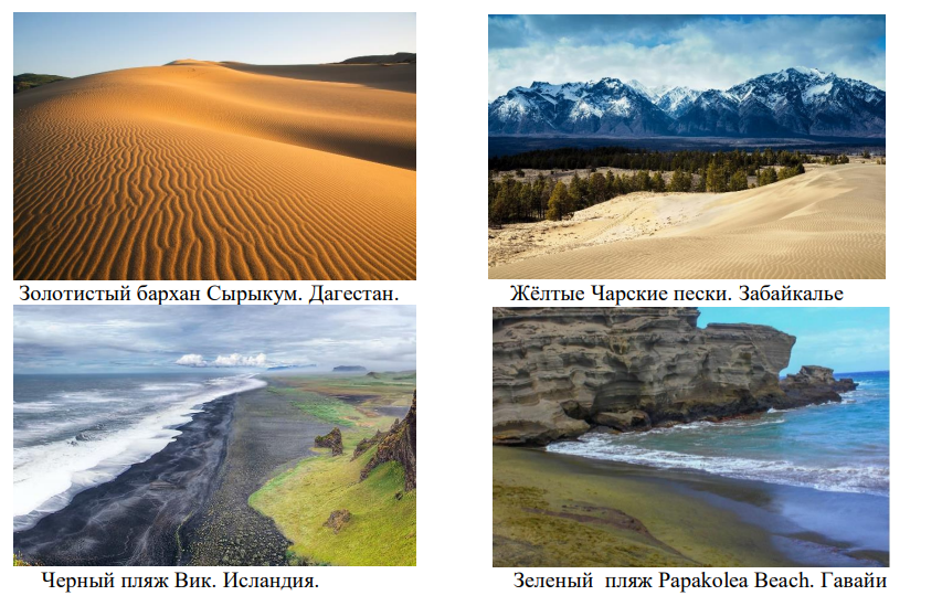 Песок - рыхлая мелкообломочная осадочная горная порода, состоящая из зёрен (песчинок размером 0,05–2 мм), которая образуется в результате длительного разрушения и накопления песчинок различных минералов и горных пород. Именно от состава зависит цвет и другие свойства песка. Учитывая, что цветовая гамма горных пород и минералов очень богата, то песок не знает себе равных по разнообразию цветов и оттенков.