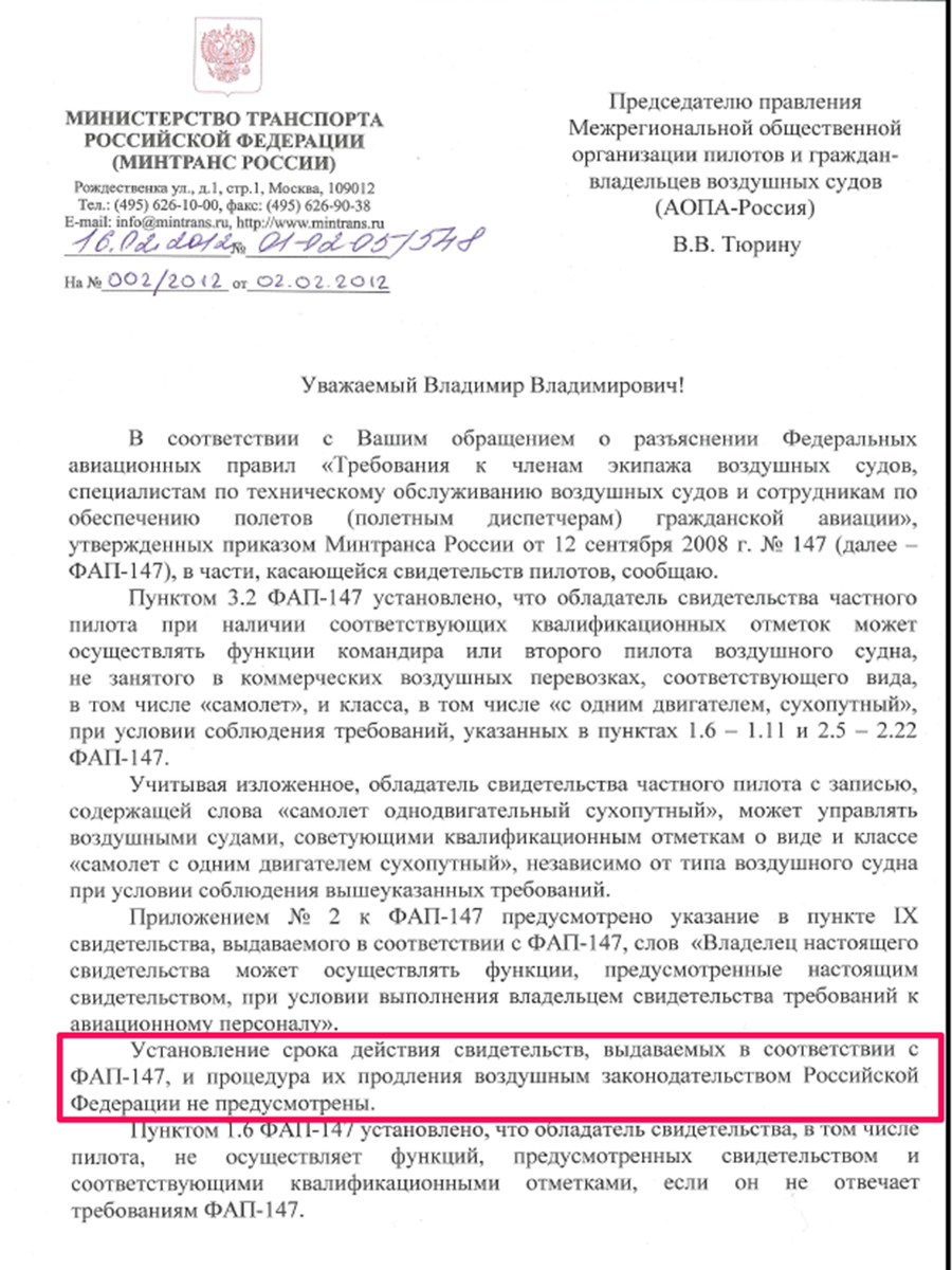 Минтранс прислал ответ. Ну в общем как обычно: "тут играем, тут не играем, тут рыбу заворачиваем"... Что забавно - в каждом новом ответе госорганов, каждый раз находится очередная причина отказа. Теперь ссылка идёт уже на Положение ВКК, которое в нарушение Федеральных авиационных правил устанавливает сроки действия свидетельства... А ещё, оказывается, нужно при каждом продлении свидетельства сдавать теорию, проверку и какой-то непонятный тренажёр...