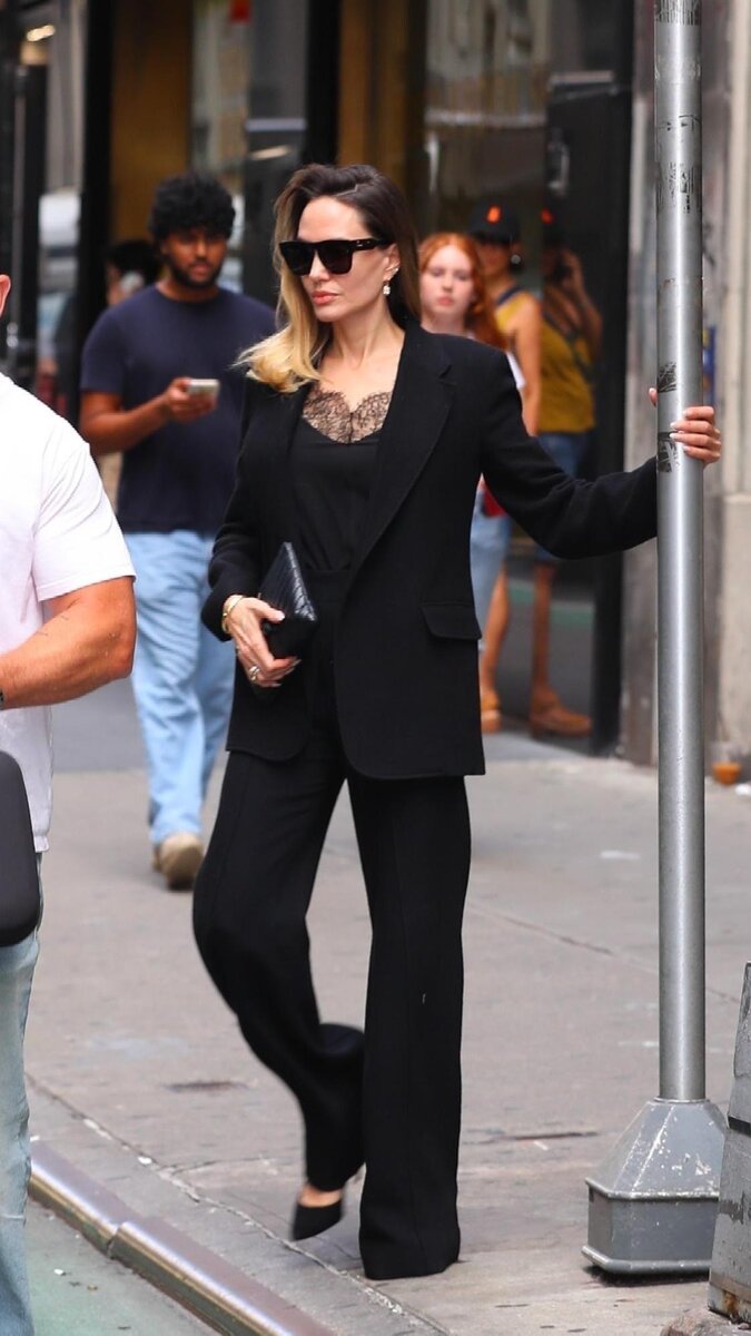 Анджелина Джоли продолжает придерживаться в своем гардеробе классического стиля, но не забывает и про современные тренды. Так, к черному костюму из прямого пиджака и брюк-палаццо актриса подобрала бельевой топ с кружевной отделкой, что сразу же избавляет образ от строгости и придает ему элегантности и роскоши. На ужин она отправилась вместе с сыном в тотал-луке, дополнив его замшевыми лодочками, кожаным клатчем и солнцезащитными очками.