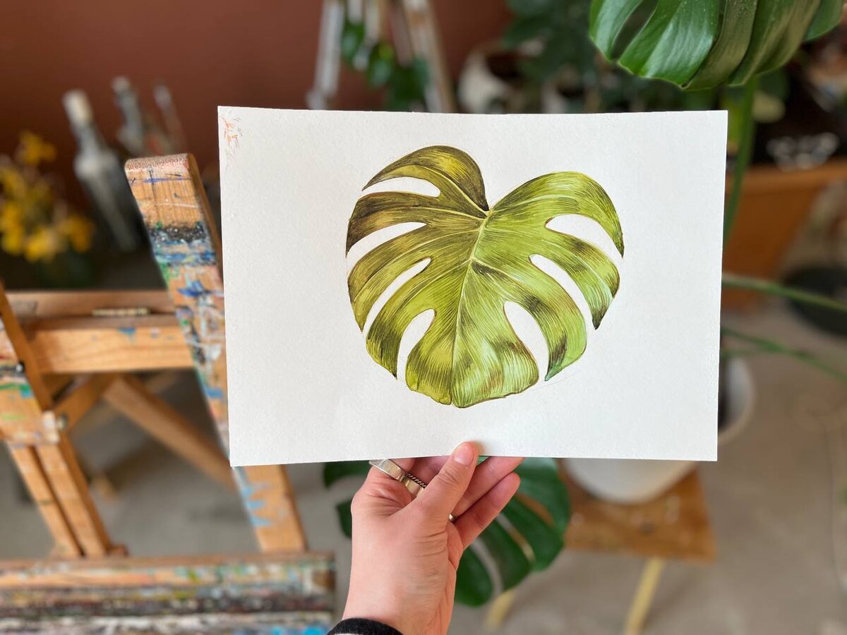 Этап 1. Композиция Начать рисовать акварелью можно с объектов, которые есть у вас дома, например листья домашних растений. Я выбрал лист протеи или монстеры. Первым делом обозначим размеры рисунка, общую форму листа простым карандашом. Этап 2. Рисунок Далее уточним форму, добавим прорези на листе и прожилки. Этап 3. Тональность Начинаю заливку цветом. Левая половина листа в тени, поэтому сразу основной цвет делаю темным. Прожилки оставляю посветлее. Здесь использую широкую кисть белку. Полностью покрываю основным зелёным левую часть листа. Можно где-то сделать чуть светлее, где-то чуть темнее, оставляю прожилки. Этап 4. Детали Правая часть листа светлее левой. Для первого слоя использую более холодный цвет, более прозрачный. Оставляю прожилки белыми. Немного добавляю теней более тёмным зелёным на правую половину листа. Обязательно полностью просушиваю. Этап 5. Завершение Далее прорабатываю светотень на листе с помощью тонкой синтетической кисти и более темного оттенка зелёного. Я