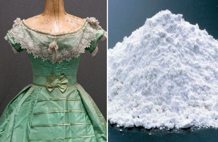 В XVIII-XIX веках в Европе активно использовали стойкий и очень популярный тогда краситель, который назывался «парижская зелень». Им покрывали не только книжные переплеты, его использовали при изготовлении обоев, покрытии посуды, им красили ткань. Цвет одежды при этом получался очень насыщенным, красивого оттенка, женское платье из такого материала выглядело просто роскошно.