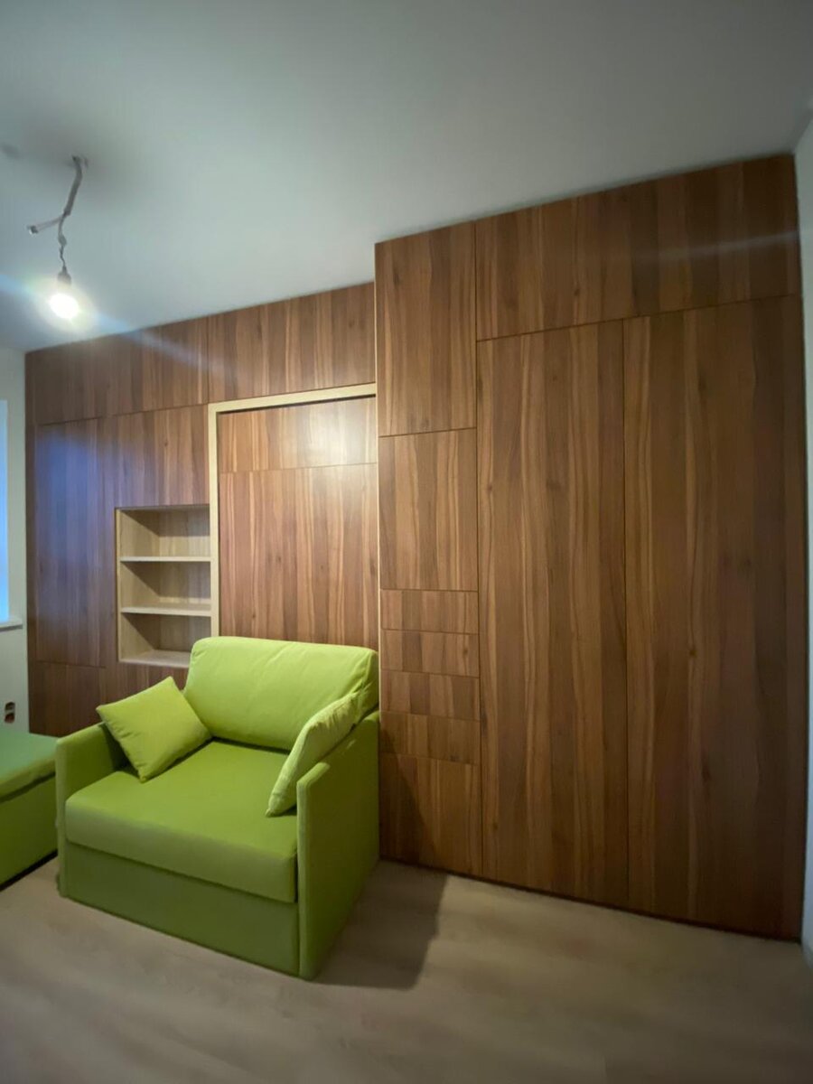 Многие детские психологи утверждают, что идеальная комната подростка должна максимально обеспечивать его автономность. Именно в подростковом возрасте у молодых людей возникает желание создать свой индивидуальный мир, в котором он устанавливает свои правила. Компания Olissys, со своей стороны предлагает решения, которые дают возможность полностью меблировать комнату всем необходимым для повседневной комфортной жизни. Предлагаем подробнее рассмотреть многофункциональную конфигурацию мебели-трансформер с помощью, которой обустроили детскую комнату. Очень важно было разместить мебель таким образом, чтобы в небольшом помещении еще осталось свободное место для встреч с друзьями. Конструкция визуально делит комнату на две части. Это происходит за счет разной глубины системы хранения и остальной частью модуля. Кровать-трансформер серии Olissys LE расположена за глубоким шкафом, что создает больше уюта для спального места. В одной плоскости с кроватью разместили антресоли, открытые полки и стел