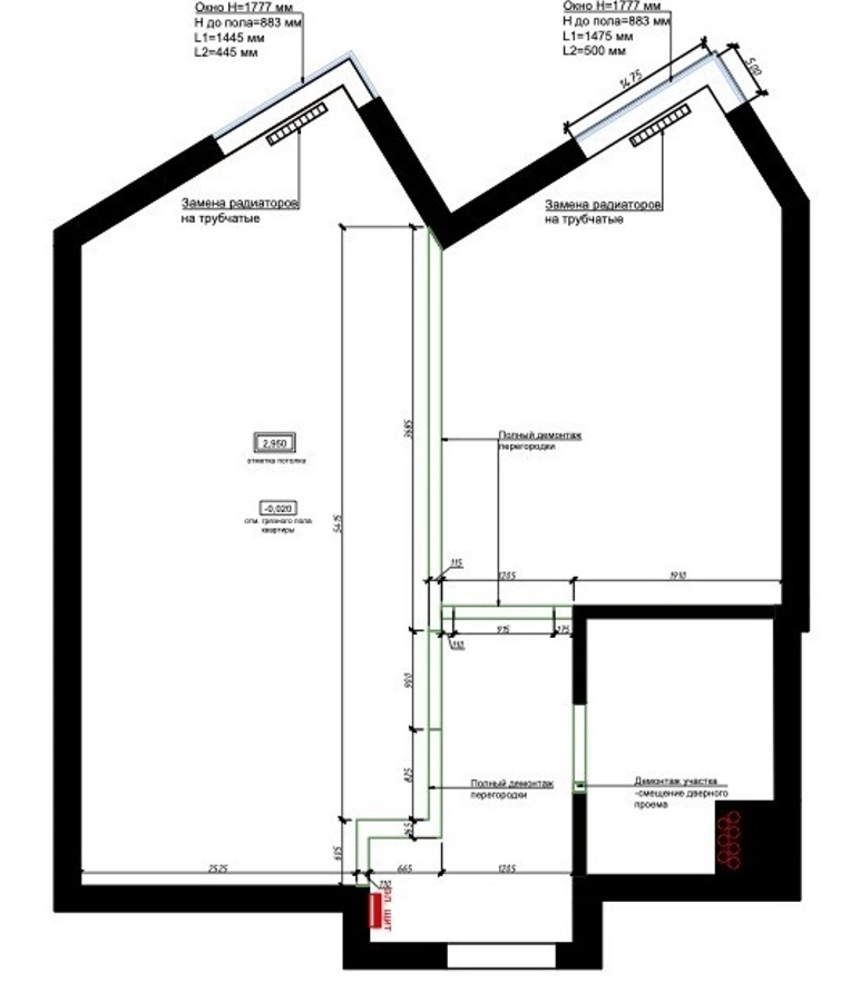 Заказчица: молодая женщина, которая пока живет одна, много работает, поэтому нужно было создать нейтральный интерьер, где можно легко расслабиться и отдохнуть. От застройщика досталась непростая планировка с двумя угловыми эркерами. Изначально это была однушка с отдельной кухней, санузлом и прихожей. Но по желанию заказчицы необходимо было выделить отдельную спальную зону и гардеробную. План квартиры от застройщика Поэтому дизайнер Виктория Вишневская решила сделать квартиру-студию, то есть перегородку между комнатой и кухней демонтировали, отделили спальню от общей зоны с одной стороны установили стеклянную раздвижную перегородку. У входа сделали небольшую, но вместительную гардеробную 3,9 м2. План после перепланировки и установки мебели. Кухня осталась на своем месте, а столовую и гостиную зону оформили в углах у эркеров. Через полупрозрачную стеклянную перегородку в спальню попадает естественный свет со стороны кухни-столовой. Как и хотела заказчица - интерьер выполнен в минималист