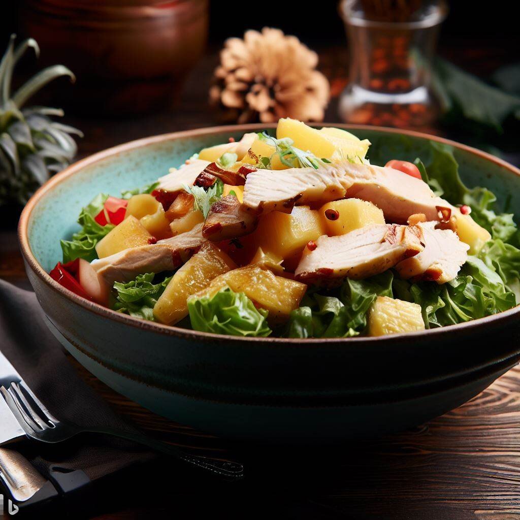 Ингредиенты: - 300 г куриного филе - 1 банка консервированного ананаса - 200 г сыра - 4 яйца - 100 г майонеза - Соль, перец по вкусу Приготовление: 1. Куриное филе отварить в подсоленной воде до готовности, остудить и нарезать мелкими кусочками. 2. Ананасы откинуть на дуршлаг, чтобы стекла вся жидкость, и нарезать мелкими кусочками. 3. Сыр натереть на крупной терке. 4. Яйца отварить вкрутую, остудить, очистить и нарезать мелкими кусочками. 5. Все ингредиенты сложить в салатницу, посолить и поперчить по вкусу, добавить майонез и перемешать. 6. Салат украсить зеленью или ананасом и подавать. Приятного аппетита!