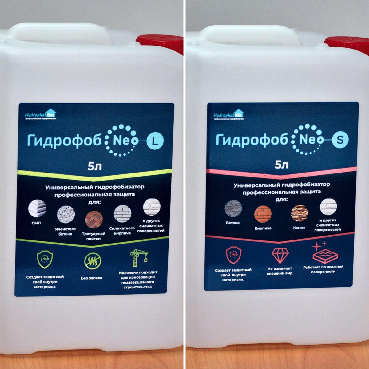 Какой гидрофобизатор лучше для бетона, камня, кирпича, газобетона, тротуарной плитки? HydrophobNeo-S и HydrophobNeo-L это универсальные гидрофобизаторы из профессиональной линейки составов HydrophobNeo, которые можно использовать для обработки бетона, газобетона, силикатного и керамического кирпича, натурального и искусственного камня, тротуарной плитки и других силикатных строительных материалов. При сравнении этих гидрофобизаторов первое, на что обращают внимание, это на существенную разницу в цене. Стоимость канистры 5л HydrophobNeo-L - 790 рублей, а стоимость канистры 5л HydrophobNeo-S - 2999 рублей. Поэтому возникает естественный вопрос, чем эти гидрофобизаторы отличаются друг от друга, и стоит ли переплачивать? Сравниваем гидрофобизаторы HydrophobNeo-S и HydrophobNeo-L Самое главное отличие - это состав гидрофобизаторов. Отличаются как основные действующие вещества, так и растворители. HydrophobNeo-S представляет собой гидрофобизатор современного типа, это силан-силоксановая комп
