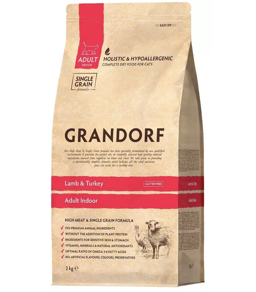 Сухой корм для кошек Grandorf («Грандорф») выпускается в Бельгии Grandorf относится к классу холистик ( это считается лучшим кормом для кошек) Рассмотрим состав корма Grandorf Lamb & Turkey INDOOR c ягненком и индейкой для кошек 2кг Состав Дегидрированное мясо ягненка (22%), Дегидрированное мясо индейки (20%), Цельнозерновой коричневый рис, Свежее мясо ягненка (12%), Свежее мясо индейки (11%), Жир индейки (4%), Порошок корней цикория (натуральный источник пребиотиков: ФОС и инулин), Свежее масло лосося (1%), Сушеная морковь, Пивные дрожжи (природный источник МОС), Сушеный антарктический криль (натуральный источник ЭПК и ДГК, 1%), Растительная клетчатка, Льняное семя, Сушеная клюква, Юкка Мохаве. Кроме заявленных в составе животных ингредиентов продукт может содержать следы ДНК других ингредиентов животного или растительного происхождения в незначительных количествах из-за технологических особенностей производства кормов. Аналитические составляющие: Сырой белок: 32%; Сырая клетчат