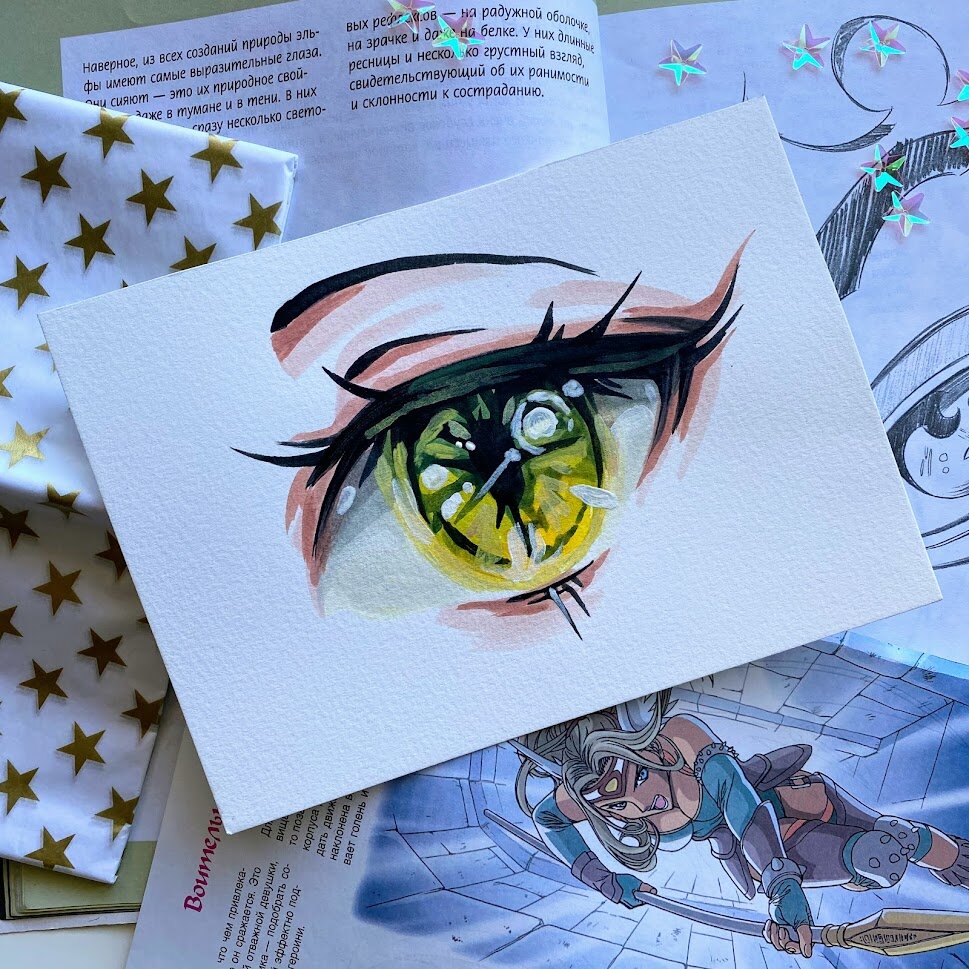 Этап 1. Композиция Создаем общую конструкцию глаза. Посередине листа намечаем вертикальный овал, а внутри него овал поменьше. Сверху, немного обрезав овал, наклоненной линией отмечаем верхнее веко, делаем его чуть толще (так реснички покажем потом). Парой линий слева справа и снизу пометьте общие размеры глаза. На подвижным верхним веком есть складка и бровь. Отмечайте линии более угловато, ведь у нас стилизованная работа. Этап 2. Работа с цветом Работа с цветом будем в акварельной технике (я пишу акрилом, вы можете работать сумой акварелью). Учет радужки я решила делать оливково-желтым, немного выходя за границы радужки для свечения. Внешние границы глаза, примыкающие к коже подчеркиваем телесным оттенком (коричневый+белый+капля розового). Этап 3. Тональность Белок глаза заливаем серым оттенком темнее кверху. Тень на радужке сверху отмечаем изумрудным оттенком. Участки с кожей тоже затемним более темным кирпичным оттенком. С цветом тоже можно работать более схематично и мазками. Чер