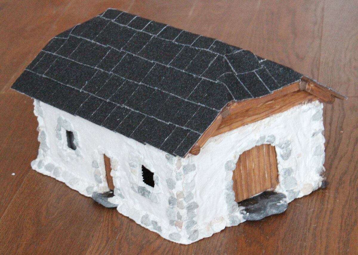 Вес: ~2 кг. Изготовление В этой модельке я опробовал метод заливки стен. По задумке, стены должны иммитировать грубо оштукатуренную каменную кладку. Технология заливки была следующая: на дощечке, покрытой пищевой плёнкой, была закреплена рамка из реек, которая ограничивала растекание раствора. Далее, из камня в форме выкладывались углы стен, оконные и дверные проёмы. После чего форма была залита цементным раствором. По результату были получены четыре стены. Они были зафксированы и скреплены тем же цементным раствором. Крыша это каркас из реек, покрытый сверху трёхслойной фанерой. Сверху фанера поклеена нарезанными кусочками наждачной бумаги. Окошки и дверцы изготовлены из тонких деревянных палочек. Стоит отметить, что модель плохо приспособлена к условиям улицы, поскольку содержит деревянные элементы. Они деформируются от перепада влажно