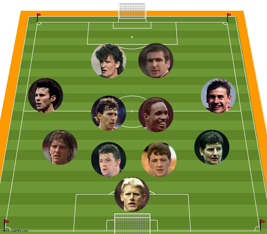 Становление «МЮ» Фергюсона проходило не быстро, тренер пришел в команду, занимавшую в чемпионате Англии 1986/87 предпоследнее место в турнирной таблице, а завершил английское первенство на 11-й позиции. Чемпионат Англии 1987/88 манкунианцы закончили на 2-м месте, но в течении следующих двух сезонов команду лихорадило (11-е, 13-е места). Казалось терпению руководства «МЮ» подходит конец, однако в сезоне 1989/90 шотландский тренер выиграл с командой свой первый трофей (Кубок Англии). В сезоне 1990/91 «МЮ» в финале Кубка обладателей кубков переиграл «Барселону», 2:1. В 1991 году «Юнайтед» приобрел датского вратаря Петера Шмейхеля, защитника Паркера, полузащитника Канчельскиса. В полный голос заявили о себе молодые Гиггз и Шарп. В ноябре 1992 к команде присоединился харизматичный француз Эрик Кантона, и манкунианцы наконец-то выиграли чемпионат Англии. В сезоне 1993/94 «Манчестер Юнайтед» покорился дубль (победа в чемпионате и кубке страны). Однако после 1994/95, когда «МЮ» остался без трофеев, не считая Суперкубок Англии, Фергюсон взялся на омоложение состава. В этой статье предлагаю свой вариант символической команды «МЮ» Фергюсона (1986-1994).