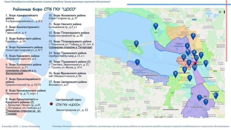 Берете его паспорт, в котором нет регистрации, СНИЛС и медицинское заключение и вместе с ним идете в любое бюро Центра Организации Социального Обслуживания населения (ЦОСО). Они есть в каждом районе города (адреса и телефоны на фото). В ЦОСО опытные сотрудники помогут вашему подопечному заполнить заявление на получение Индивидуального Плана Предоставления Социальных Услуг (ИППСУ).