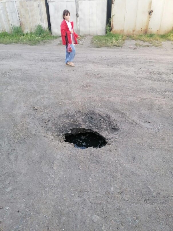 И еще. Двухметровая яма с канализационными стоками находится в нескольких метрах от новой детской игровой площадки рядом с каныгой, мы писали об этом в группе, и рядом с этой сквозной дорогой. Там же, во дворе этого дома по улице Советской 165. Не исключено, что грунт подмыла канализация из этих колодцев или каныги, как их здесь называют. Усугубил ситуацию неконтролируемый поток машин. И кто знает, где случится очередной провал грунта в этом дворе?!! Пока яму засыпали щебнем... Люди, будьте осторожнее! Берегите детей!