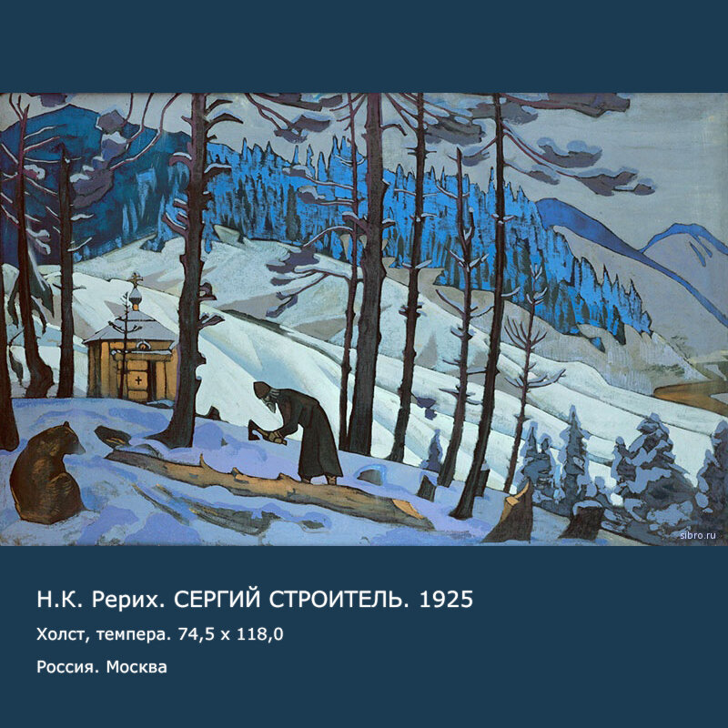 На картине Н.К. Рериха «Сергий Строитель» изображён медведь, мирно сидящий и дожидающийся Святого Сергия.