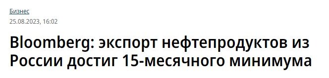 Экспорт нефтепродуктов из России находится на минимальных отметках за последние 15 месяцев - такие данные приводит Bloomberg со ссылкой на данные аналитической компании Vortexa с 1 по 20 августа. По данным Vortexa, в августе Россия сократила экспорт своих нефтепродуктов еще на 14%, объем ежедневного экспорта составляет 2,24 млн баррелей, что является самым низким показателем с мая 2022 года. Приводятся данные и в разрезе нефтепродуктов. Экспортные поставки дизтоплива (который является основой экспорта нефтепродуктов, занимая в нем долю 45%) упали до уровня ниже 1 млн баррелей в сутки. Поставки бензина и компонентов к нему сократились аж на 43% год к году, сейчас они составляют всего 66 тыс баррелей в сутки. Экспорт нафты снизился на 22% до 371 тыс баррелей в сутки, мазута - до 624 тыс баррелей в сутки (самый низкий показатель с марта 2022 года). Экспорт сырой нефти, к слову, тоже снижается, и сейчас достиг минимального значения с декабря прошлого года (когда были введены эмбарго и пото
