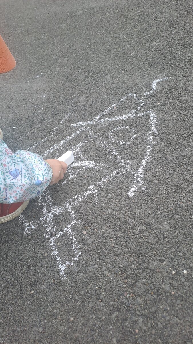 Я сижу на корточках возле скамеек и рисую вместе с дочкой очередной домик на асфальте.
