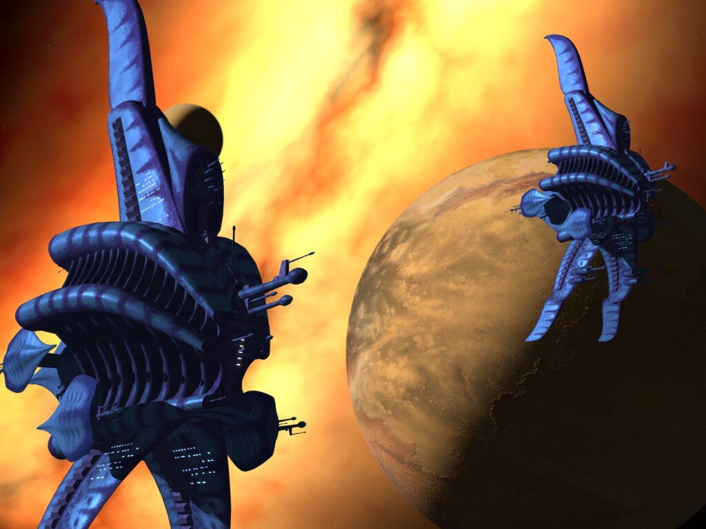 Здесь мы видим еще несколько фотографий крейсера минбарцев рядом с "Вавилоном-5". На снимке сверху мы наблюдаем, как минбарский крейсер проходит между "Вавилоном-5" и планетой. Посмотрите, как высоко простираются плавники над и под станцией, несмотря на километровые расстояния?