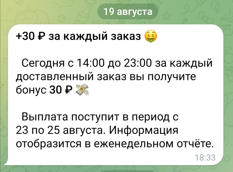 Периодически курьерам прилетают персональные цели - некие условия, за выполнение которых ждёт вознаграждение. Например: Бывают и более привлекательные: На неделе занималась основной работой и почти не курьерила, а в субботу решила воспользоваться возможностью. Расскажу, как прошёл мой день и удалось ли сделать 9 доставок. По опыту, пешему курьеру на 9 заказов нужно 6-8 часов. Мне лично удобнее делать это не одним махом, а выйти на 3-4 часа утром и потом добить оставшееся количество вечером. 7:59. Открываюсь. Взяла на это время плановый 4-часовой слот - если заказов будет мало, хотя бы получу минималку. Первый заказ прилетает прям тут же - во "Вкусно - и точка". Несмотря на раннее утро, там уже толпится народ: Не успеваю отнести эту доставку, как прилетает следующая, из "Пятёрочки". Заказ небольшой - бэпэшки и напитки. Давно не работала по утрам, иду и наслаждаюсь пустыми улицами. Людей почти нет, только собачники гуляют со своими питомцами. 8:54. Выполнено 2 заказа из 9, и нас
