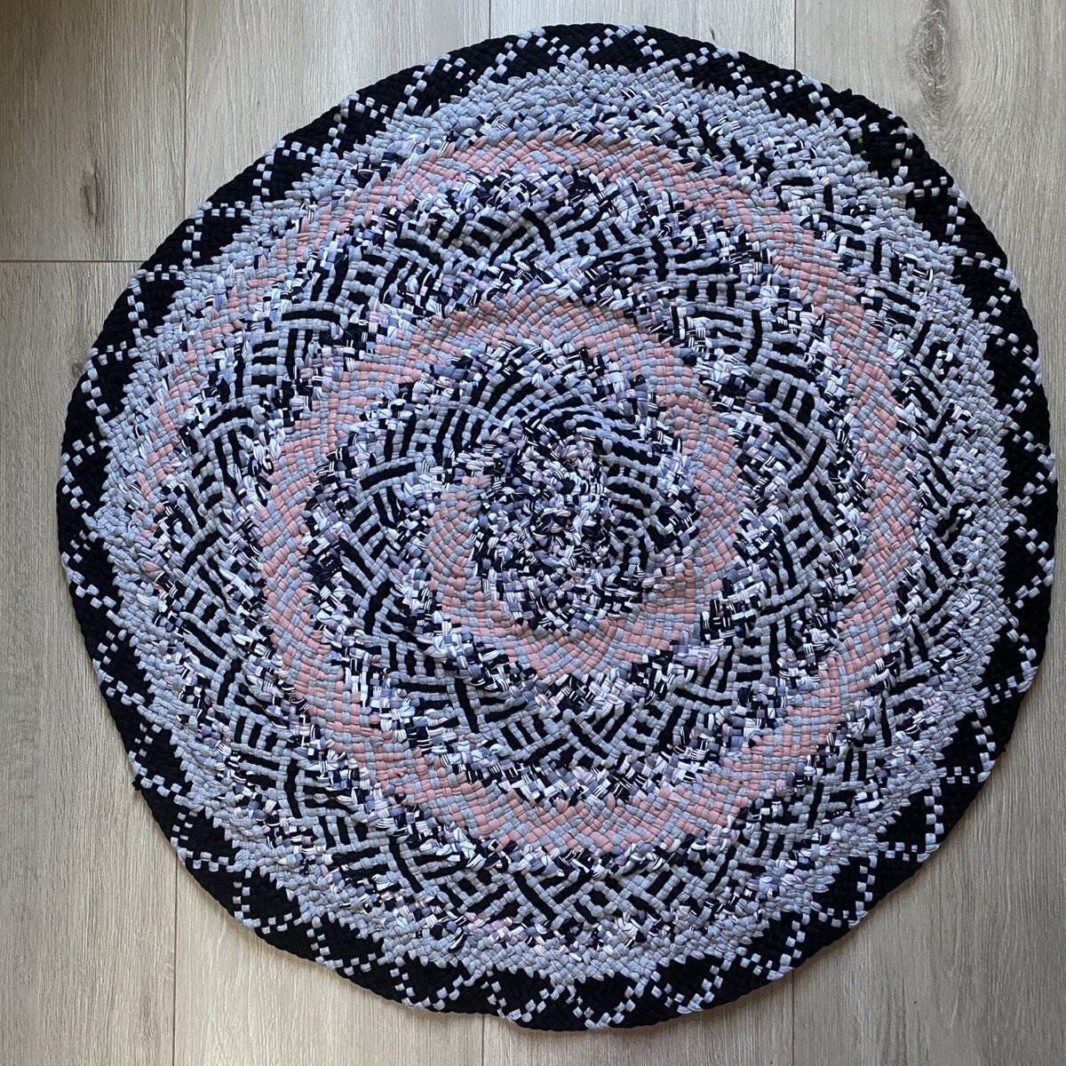 Недавно дочери сумку купила и к ней в подарок прилагался пакетик с конфеткой и какой то ерундой из ниток с бантиком. Мило,незатейливо и приятно. Дочь и говорит, что мол придумай тоже что-нибудь такое. Я и думала. Ну к примеру нитки остаются, можно сплести незатейливый браслетик, брелочек,а то и прихватку в комплект к коврику. Я доплела коврик, сейчас прихватку из остатков сделаю. А коврик пока в стирке, потом сушка, отпаривание и буду бирку пришивать.