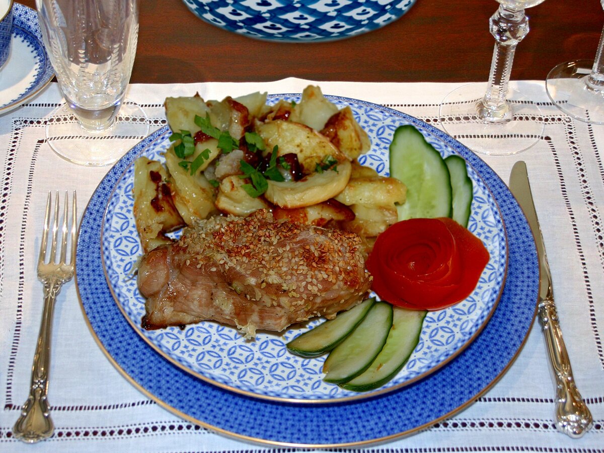 Рецепт для мультиварки и духовки. Продукты Свинина - 600 г Лук - 1 шт. Картофель - 700 г Кунжут Растительное масло Соль Тёртый сыр Соус: 2 ст. л. соевого соуса 2 ст. л. мёда 2 зубчика чеснока Приготовление 1. Сделать соус - смешать соевый соус и мёд. Выдавить чеснок и перемешать. 2. Обмазать этим соусом кусок свинины со всех сторон. 3. В чашу мультиварки налить растительное масло. 4. Положить на дно чаши лук, нарезанный полукольцами. 5. В середину выложить свинину. 6. Вокруг расположить порезанный и подсоленный картофель. 7. Свинину посыпать кунжутом. 8. Установить программу «Выпечка» на 40 минут. 9. После сигнала посыпать картофель сыром и переставить чашу в духовку под гриль на 10 - 15 минут. 10. Горячую свинину нарезать на ломтики и выложить на тарелки вместе с картофелем. 11. Можно добавить свежие овощи и зелень. 12. Мясо в разрезе: Другие рецепты со свининой: