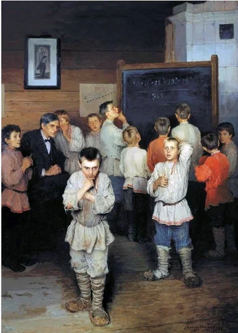 Перед вами известная картина "Устный счет". Она была написана художником Николаем Петровичем Богдановым-Бельским в 1895 году, а сейчас хранится в Третьяковской галерее. Пробовали ли когда-нибудь решить пример, написанный на классной доске? Кстати, обратите внимание: задачу решают крестьянские дети, причем в уме! Вот этот пример: Эта картина, можно сказать, документальная. Сельская школа существовала именно в таком виде, а изображенный на ней учитель - это выдающийся русский педагог и просветитель Сергей Александрович Рачинский. Более полное название картины - "Устный счет. В народной школе С.А. Рачинского". Отметим, что сам художник Николай Богданов-Бельский тоже присутствует на картине как один из маленьких учеников Рачинского. С.А. Рачинский (1833 - 1902), дворянин, после окончания Московского университета вернулся в родное село Татево Смоленской губернии для того, чтобы открыть там школу для крестьянских детей. В 1875 году он построил на собственные средства не только двухэтажную шк