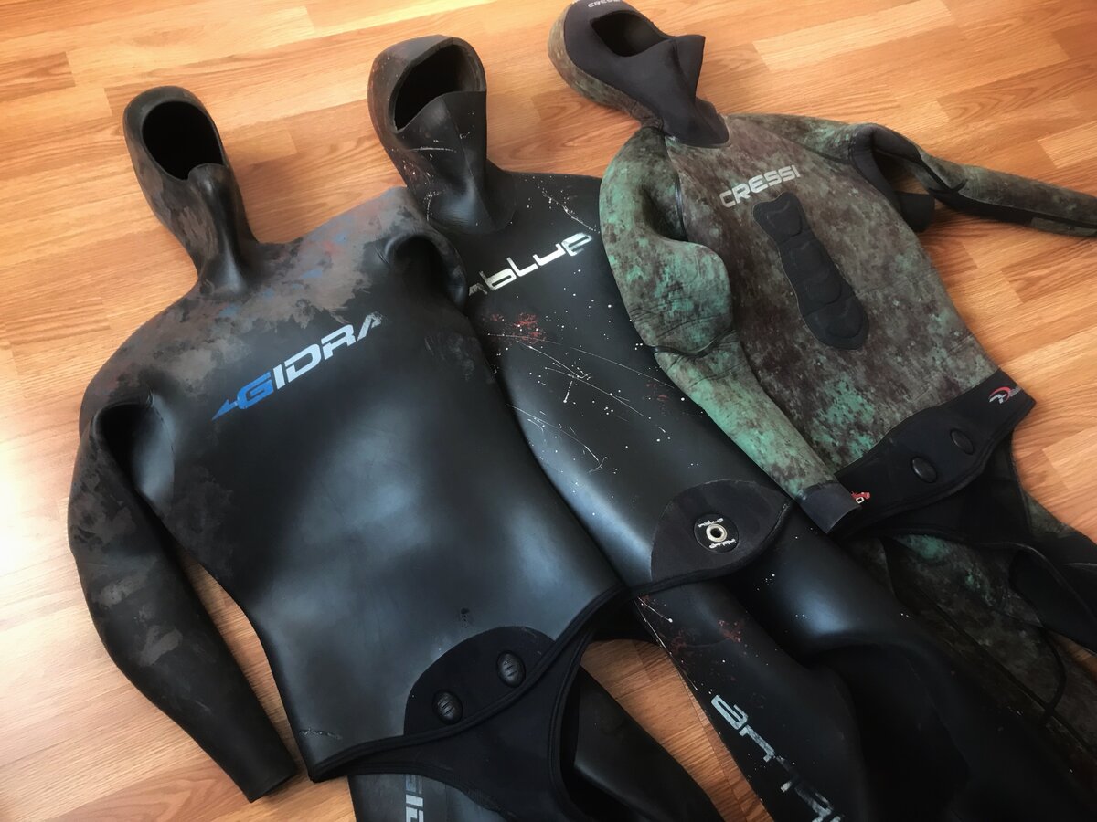 Гидрокостюм один из ключевых элементов снаряжения подводного охотника. Охотничий гидрокостюм представляет из себя комплект из куртки с капюшоном и штанов с лямками или без. Внутреннее покрытие костюма как правило открытая пора. Снаружи может быть как голый неопрен так и тканевое покрытие из нейлона или лайкры. Ключевая характеристика костюма это толщина неопрена из которого он сшит (склеен). Исходя из температуры воды подбирается и толщина костюма. На Каспийском море в охотничий сезон температура воды может быть от 10 градусов в начале сезона до 28 градусов в самые жаркие месяцы, но большую часть времени температура воды находится в диапазоне 20-25 градусов. Исходя из этой характеристики с большой натяжкой можно попробовать закрыть большую часть сезона костюмом 5мм. При возможности желательно к 5мм добавить и 7мм, и 3мм. Большую роль в выборе толщины костюма играют индивидуальные особенности в переносимости температуры. Тесно с толщиной костюма связан и вид неопрена. Чем ниже плотност