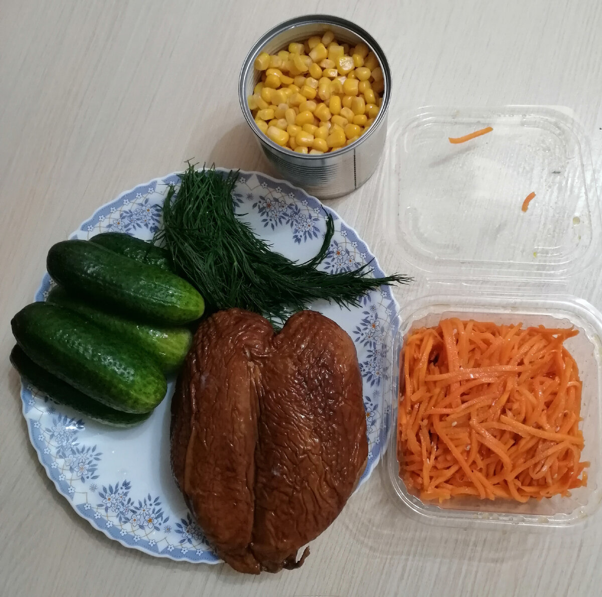 Сытный и легкий в приготовлении салат – то, что нужно для домашнего стола. Попробуйте закуску из копченой курицы, моркови по-корейски, кукурузы и огурцом. Блюдо порадует вас ярким вкусом и пряным ароматом. Ингредиенты : Приготовление: Копченое куриное мясо аккуратно отделяем от кости и нарезаем его тонкой соломкой. Выкладываем нарезанную курицу в салатницу. Такими же тонкими кусочками нарезаем и заранее промытые огурцы. Мелко нарезаем зелень. Консервированную кукурузу выкладываем в сито и даем соку полностью стечь. В салат отправляем кукурузу, готовую корейскую морковь, нарезанные огурцы и зелень. Солим, перчим и заправляем майонезом. Приятного аппетита!