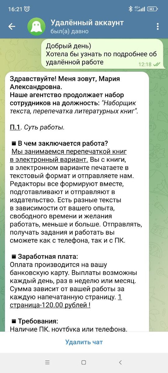 Как и любой студент я искала подработку во время учёбы, и на просторах Авито попалось объявление "Наборщик текста, перепечатка литературных книг". Работа не сложная и не на полный рабочий день. Откликнулась на вакансию, далее меня направили в Телеграмм. Там описали суть работы, заработную плату, требования и сразу выслали список актуальных заданий, также там были ответы на часто задаваемые вопросы, по запросу могли предоставить юридическую информацию: Выбрала задание, мне выслали файл - скан книги. По первым строчкам нашла эту книгу в интернете и скопировала текст. Здесь уже было понятно, что передо мной мошенники. На следующий день скинула файл с перепечатанным текстом, в течение дня его проверили и перенаправили на бухгалтера: Перейдя по ссылке, открылась страница Сбербанка (вернее похожая на Сбербанк), где нужно было ввести данные карты, включая CVC, для получения оплаты. Вероятнее всего, заполнив эти данные, с карты списали бы деньги, поэтому я не рискнула и закончила на этом. П