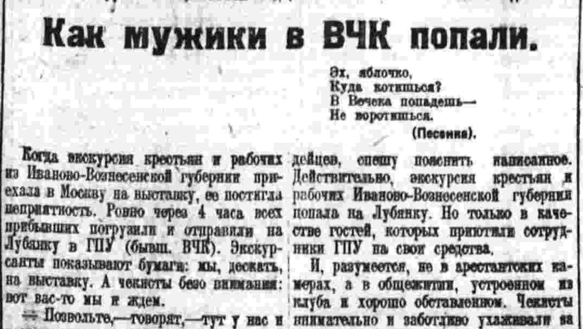 (Песенка). Когда экскурсия крестьян и рабочих из Иваново-Вознесенской губернии приехала в Москву на выставку, ее постигла неприятность. Ровно через 4 часа всех прибывших погрузили и отправили на Лубянку в ГПУ (бывш. ВЧК). Экскурсанты показывают бумаги: мы, дескать, на выставку. А чекисты безо внимания: вот вас-то мы и ждем. — Позвольте,—говорят,— тут у нас и коммунисты есть, зачем же всех огулом? — Мы нынче не разбираем. Всех заберем. Так и попали на Лубянку. Режим на Лубянке—сами знаете какой. Только одно послабление сделали чекисты мужикам: разрешили днем ходить на выставку. А к вечеру пожалуйте на Лубянку по положению. Чего только с мужиками тут не выделывали, И котлеты заставляли есть, и разные супы-борщи, и на кроватях с чистыми простынями под новыми одеялами спать принуждали. Одним словом, натерпелись мужички всячники. Как редактор «Бедноты», пошел я к этим ребятам на свидание. Дело знакомое,
