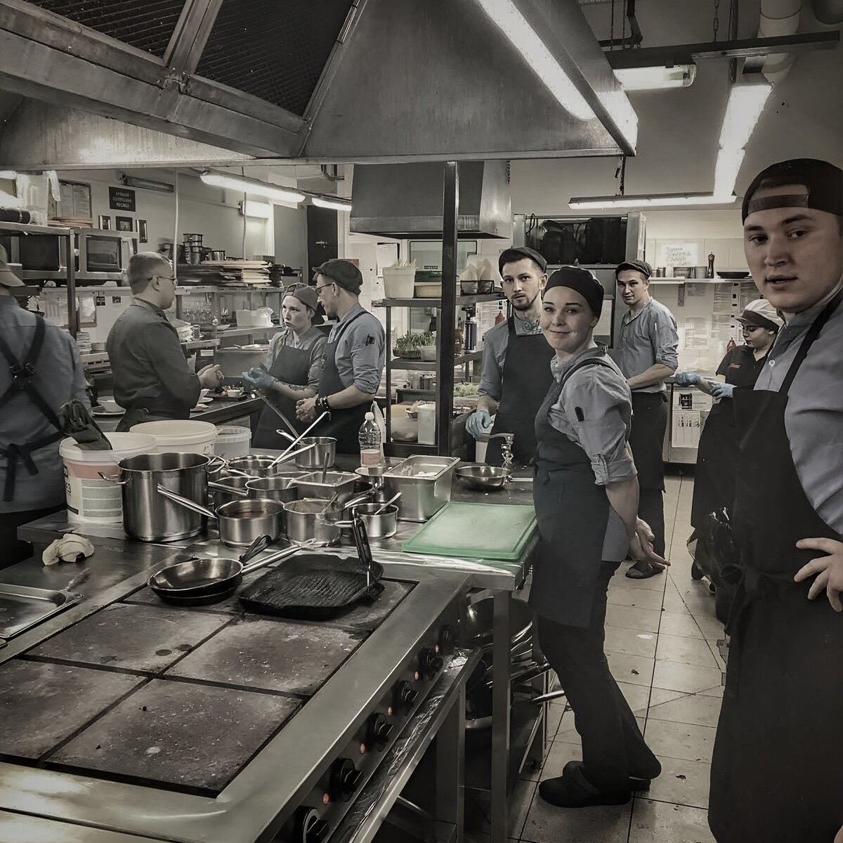 Сегодня пойдет рассказ про то, как не любят повара, когда кто-то чужой работает на их кухне. В те далекие времена, я только только начал работать, поэтому всё было в новинку и все новые люди, приходившие в жизнь через профессию, всегда были какими-то особенными. Катаем очередную длинную серию банкетов так, что все дни слились в один большой и всё примелькалось. Очередное утро застало меня, еле проснувшимся уже на кухне, в общем, сладко позевывая и протирая глаза, в одном тапке и с кружкой чая в руках, появился на кухне, с трудом понимая, что я тут делаю. Кухня, как всегда встретила шумом вытяжки, гомоном поваров и мерным перестукиванием ножей, новыми лицами, точнее группой лиц, мирно стоявших в углу кухни, шепчущихся о чем-то своем. И тут я начал просыпаться и почувствовал, что как-то тихо на кухне - нет привычных шуток и смеха, все чего-то переглядываются, я пожал плечами, сказал всем: - "Доброе утро!", - и пошлепал в одном тапке искать второй и шефа, потому как только он способе